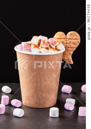 Paper cup with hot drink with marshmallows on dark background. Recycling and eco friendly concept.