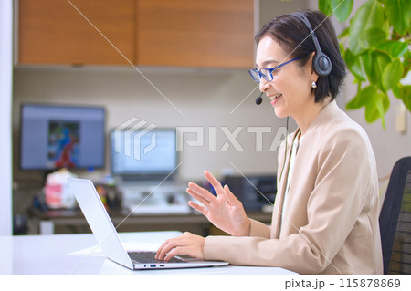 オフィスで仕事をするヘッドセットを付けたミドル女性