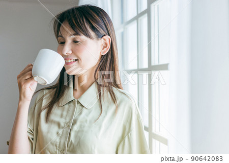 部屋でホットドリンクを飲む女性