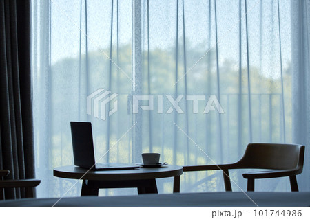 ホテルの客室の窓際に置かれたノートパソコンとコーヒーの様子