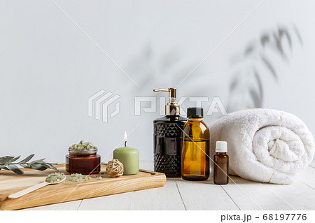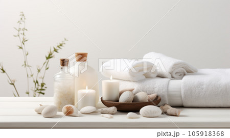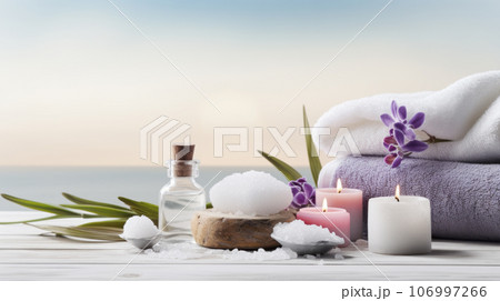 Beautiful spa composition on massage table in wellness center, copyspace, leaves' shadow