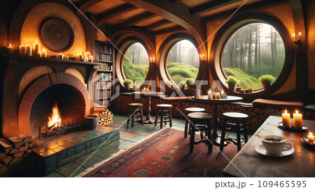 ホビット村のコーヒーショップからの眺め。外は雨降り。AI生成画像