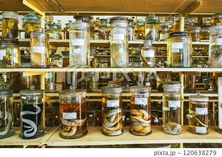 Animals in formaldehyde. Close-up reptiles, reptiles and amphibians in glass jars. Animal preparations filled with formaldehyde solution. Herpetology. Laboratory for study of snakes and other reptiles