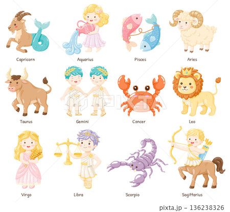 Cute Zodiac Signs Cartoon Collection 12 Astrology Symbols Set