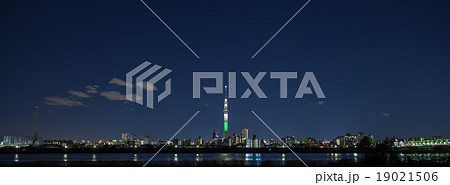 東京スカイツリーの夜景 ライトアップ「ホワイトツリー」 隅田川 縦位置