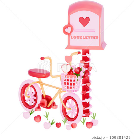Valentine mailbox with bicycle adorned with hearts and flowers heart-shaped on a transparent background, 3D rendering