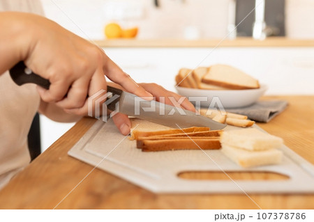 women's hands slicing bread with a knife on a board