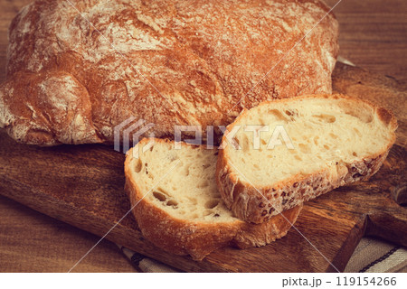 sliced ciabatta , on a chopping board, italian bread, close-up, Italian cuisine, breakfast, no people,