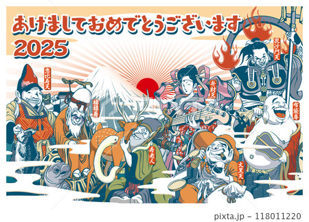 2025年賀状テンプレート「ちょっとおかしな七福神」ハッピーニューイヤー 手書き用スペース付