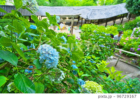 【備中国一宮】吉備津神社のアジサイ園に咲く青いアジサイの花と回廊3 岡山県岡山市北区