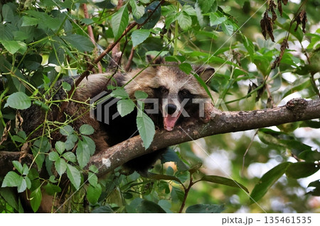 木に登ってあくびをするタヌキ