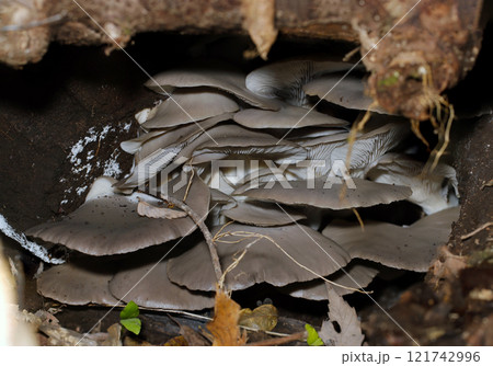湿った暗い林内の倒木全体から発育する天然野生のヒラタケたち(ストロボマクロ接写)