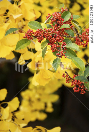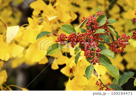 晩秋の銀杏の黄色い葉とモチノキの赤い実と緑の葉