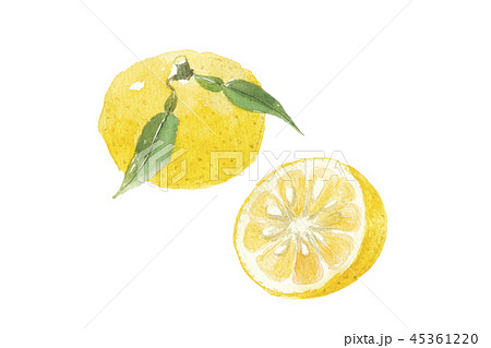 柚子(丸ごとと半分にカットしたもの)のリアルな水彩イラスト