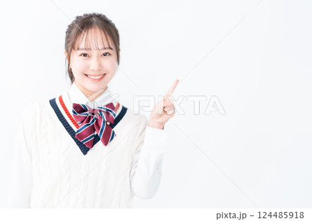 人差し指を立てて微笑むニット姿の女子高生 白バック