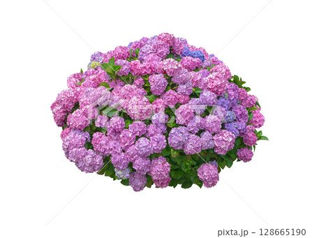 Hydrangea macrophylla shrub with blue and pink flowers isolated on white background.