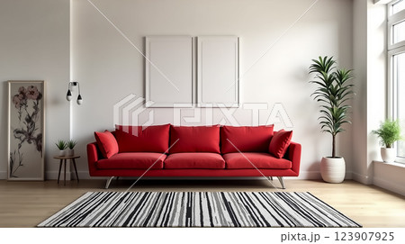Modern Living Room with Cozy Sofa, Blank Wall Art Space, Green Plants, and Stylish Decor