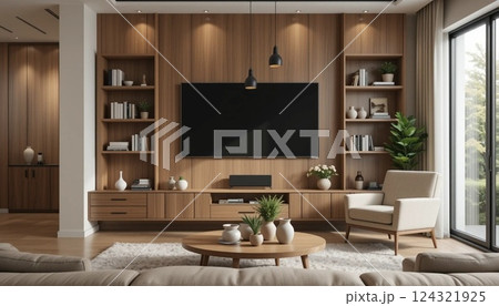 Modern Living Room with Wooden Wall Panel, Flat Screen TV, and Stylish Decor.