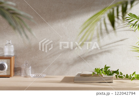 Table top white marble counter copy space cement wall with shadow sunlight from plant