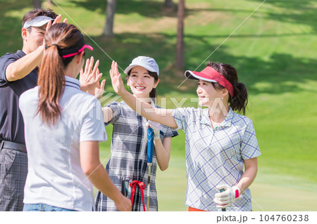 ゴルフ場でハイタッチするゴルフ仲間の女性達