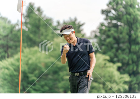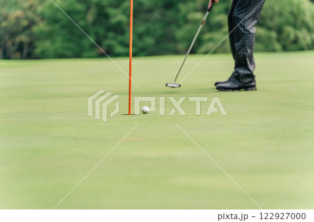 ゴルフ場のグリーンでゴルフをするゴルファーの男性(パター)