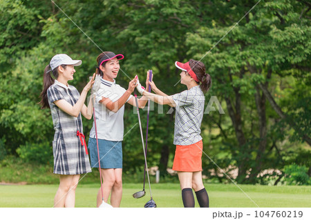 ゴルフ場でハイタッチするゴルフ仲間の女性達
