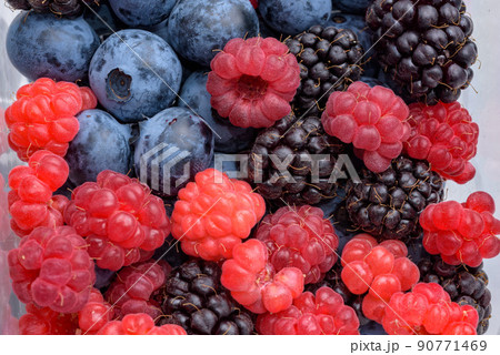 収穫した沢山のベリー(ブルーベリー、ラズベリー、ブラックベリー)
