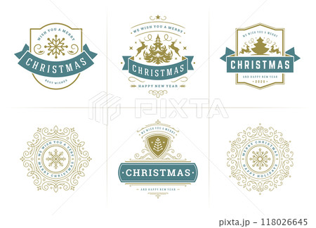 Christmas vector typography ornate labels and badges, happy new year and winter holidays wishes for vector illustration