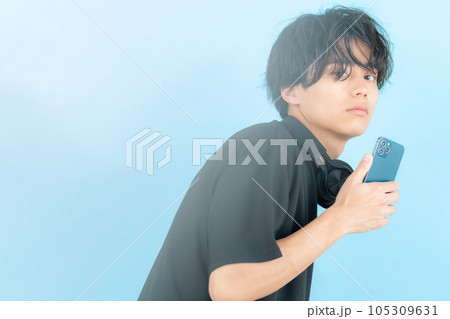 スマホを操作するブルーバックの若い男性