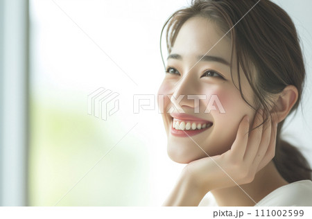 若い女性の笑顔 顔アップ ビューティーイメージ(AI生成画像)