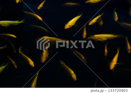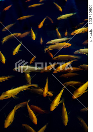 蓮池を泳ぐ黄色い魚たちと蓮の花