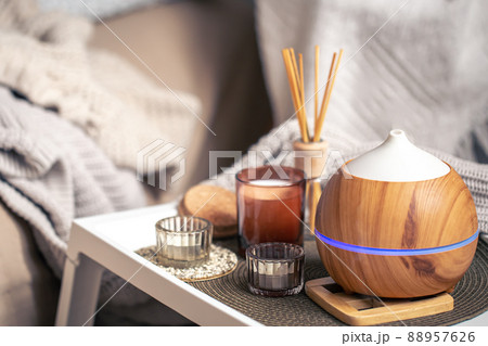 A cozy composition with an aroma diffuser and candles in a home interior.