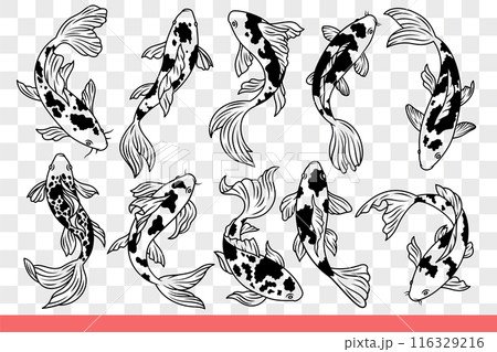 Japanese carp fish with spotted body and large fins swims in different positions. Hand drawn doodle