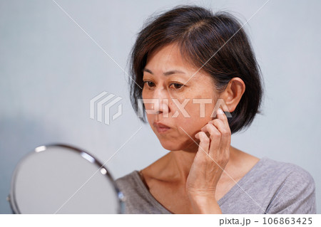 頬に手をやるシミ、シワのある老け顔の中年女性