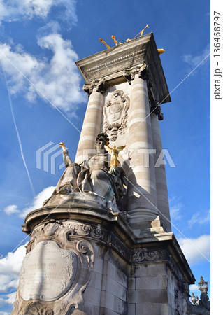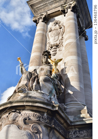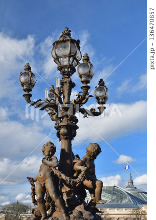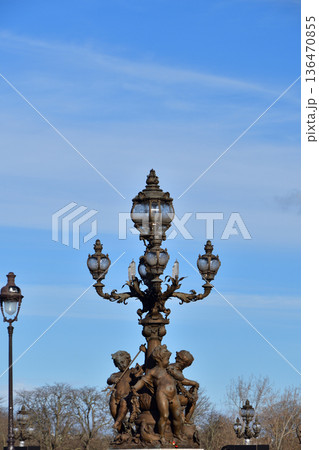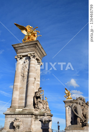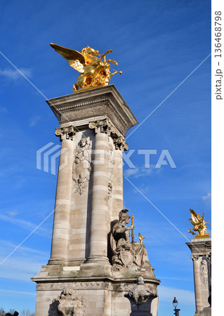 2026年2月4日撮影 冬の晴天に輝くパリ・アレクサンドル3世橋の装飾柱(親柱)建築ディテール