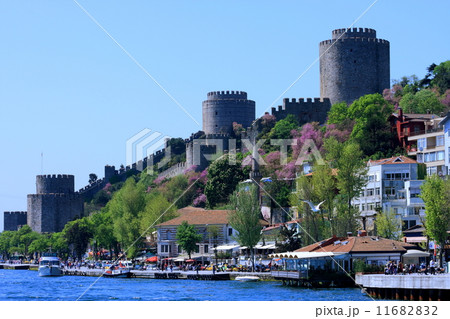 ボスポラス海峡岸辺のルメリ・ヒサール城塞を船上から展望
