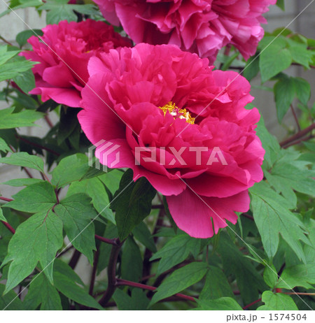 奈良県桜井市 長谷寺の回廊横に咲く牡丹の花とお坊さん