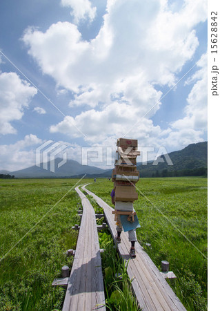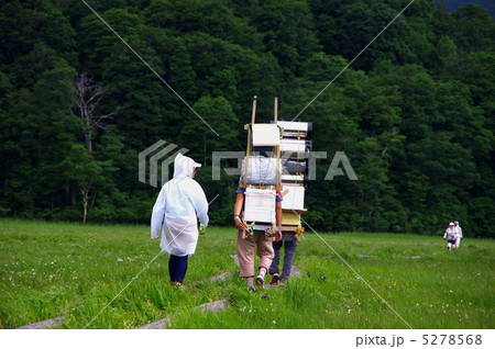 尾瀬の湿原を重い荷物を背負って歩く歩荷さん