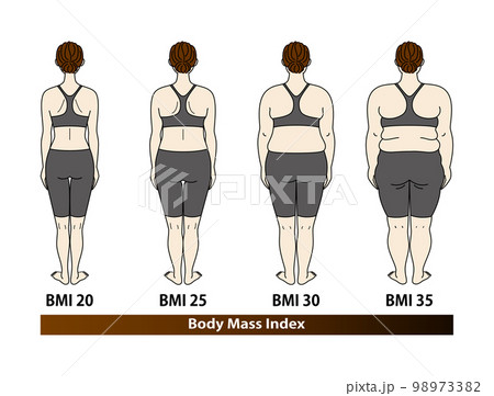 ボディマス指数別の体型変化 女性の後ろ姿 BMI (Body Mass Index) イラスト