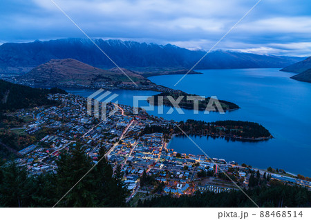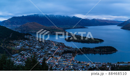 ニュージーランド クイーンズタウンのボブス・ピークの展望台から望む夕暮れ時のワカティプ湖と街並み