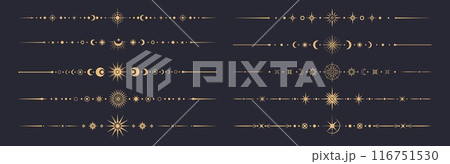 Fantasy celestial divider borders and frame lines with gold stars, moon and sun, arrows and sparks vintage boho pattern. Mystic esoteric tarot cards, astrology horoscope or zodiac divider borders