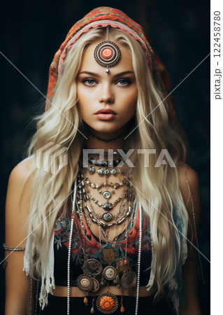 A portrait of a fashionable pretty girl dressed in boho chic style. A hippie woman wearing lots of bohemian jewelry and accessories. AI-generated