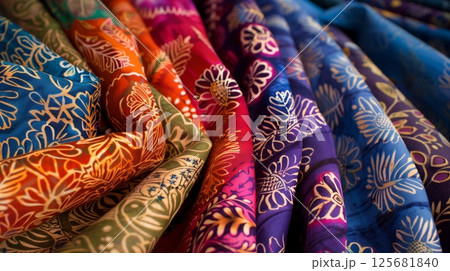 Intricate batik fabric with vibrant colors, showcasing craftsmanship. Ideal for unique clothing or decor.