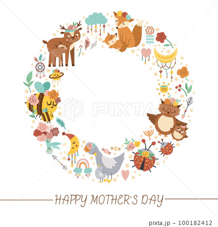 Vector round frame with Mothers day elements. Family love concept wreath. Design for banners, posters, invitations. Cute boho style holiday card template with forest animals, birds, flowers.