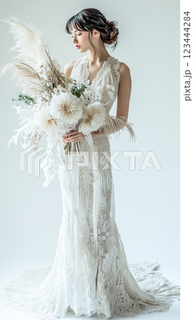 ボヘミアンスタイルのウェディングドレスを纏う花嫁