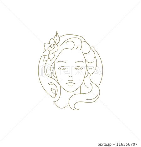 Portrait beautiful blossom flower woman in hand drawn circle frame linear logo vector illustration