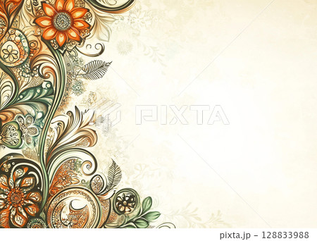A beautiful design featuring intricate floral and paisley patterns in a rich earth tone color palette, bordering a soft, light-colored background.
