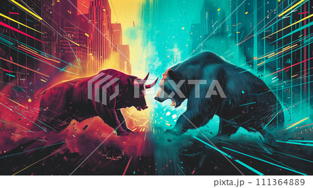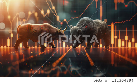 株式市場の取引チャートにおけるデジタル化された強気と弱気の対立。株式市場での取引、経済成長のイメージ