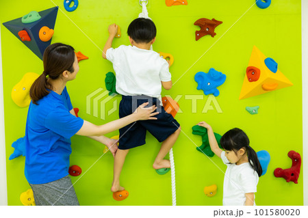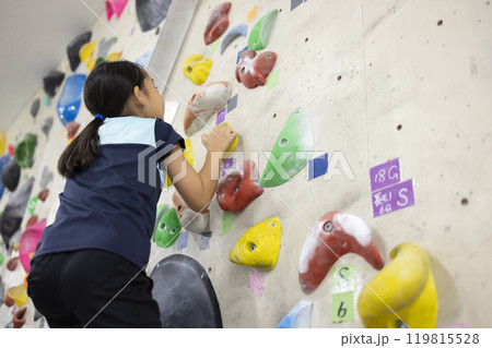 ボルダリングをする小学生の男の子