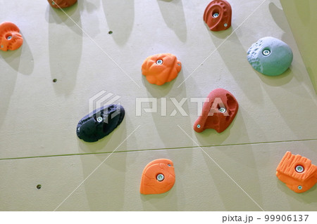 カラフルなストーンが取り付けられた、ボルダリング用の壁